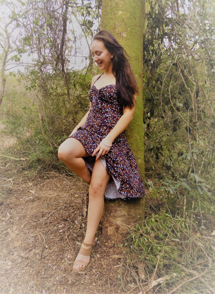 A halter neck styled summer dress with a high low skirt and a tie at the center front bust.