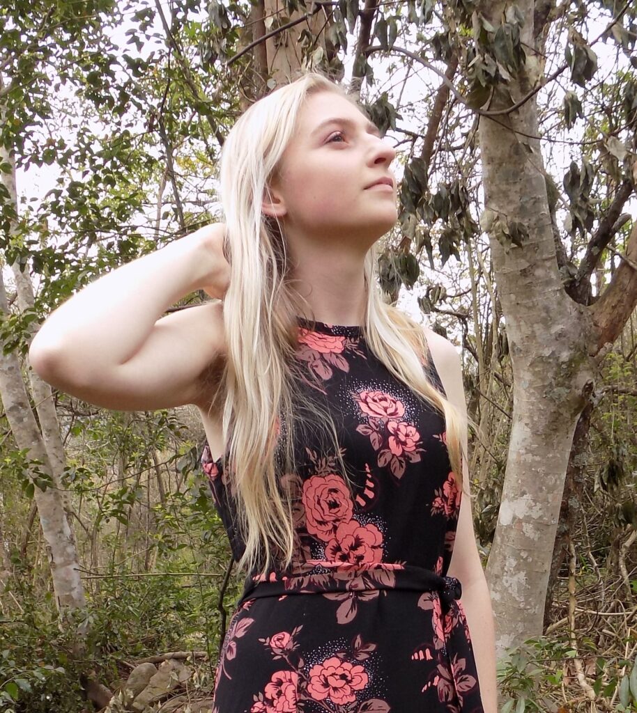 A halter neck styled summer dress with a high low skirt and a tie at the center front bust.